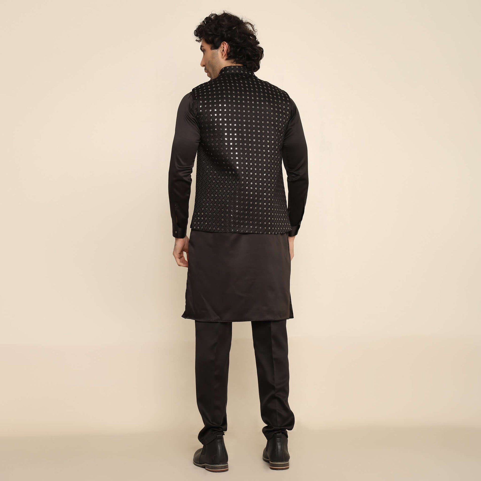Black Sequence Chikan Embroidered Kurta Koti Set for Men