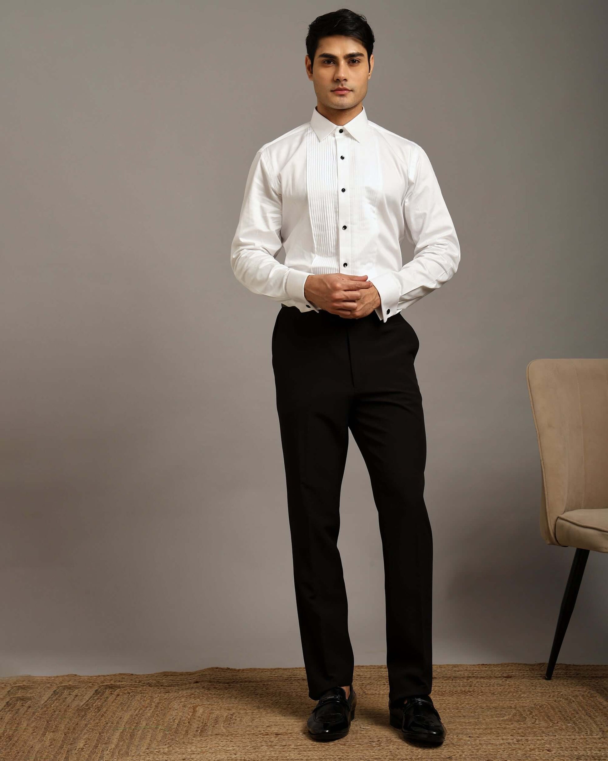 How to style & where to wear Classic Pintex White Tuxedo Shirt with Spread Collar and French Cuffs: Pair this men’s white tuxedo shirt with cufflinks, a bow tie, and a tuxedo jacket for wedding receptions, engagement parties, cocktail nights, prom nights, sangeet evenings, formal dinners, gala events, and luxury celebrations. This tuxedo shirt for men is suitable for grooms, groomsmen, wedding guests, and family members who prefer a classic men’s white formal shirt for wedding functions.