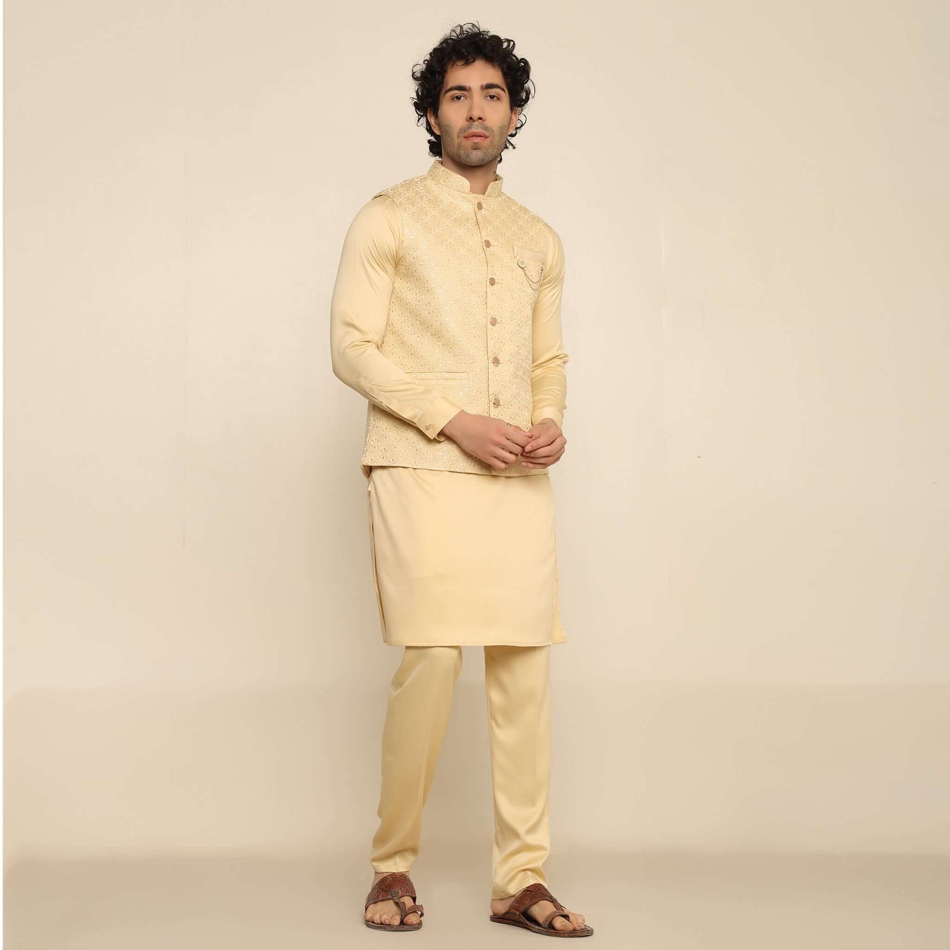 Fawn Embroidered Sequins Kurta Koti Set for Men