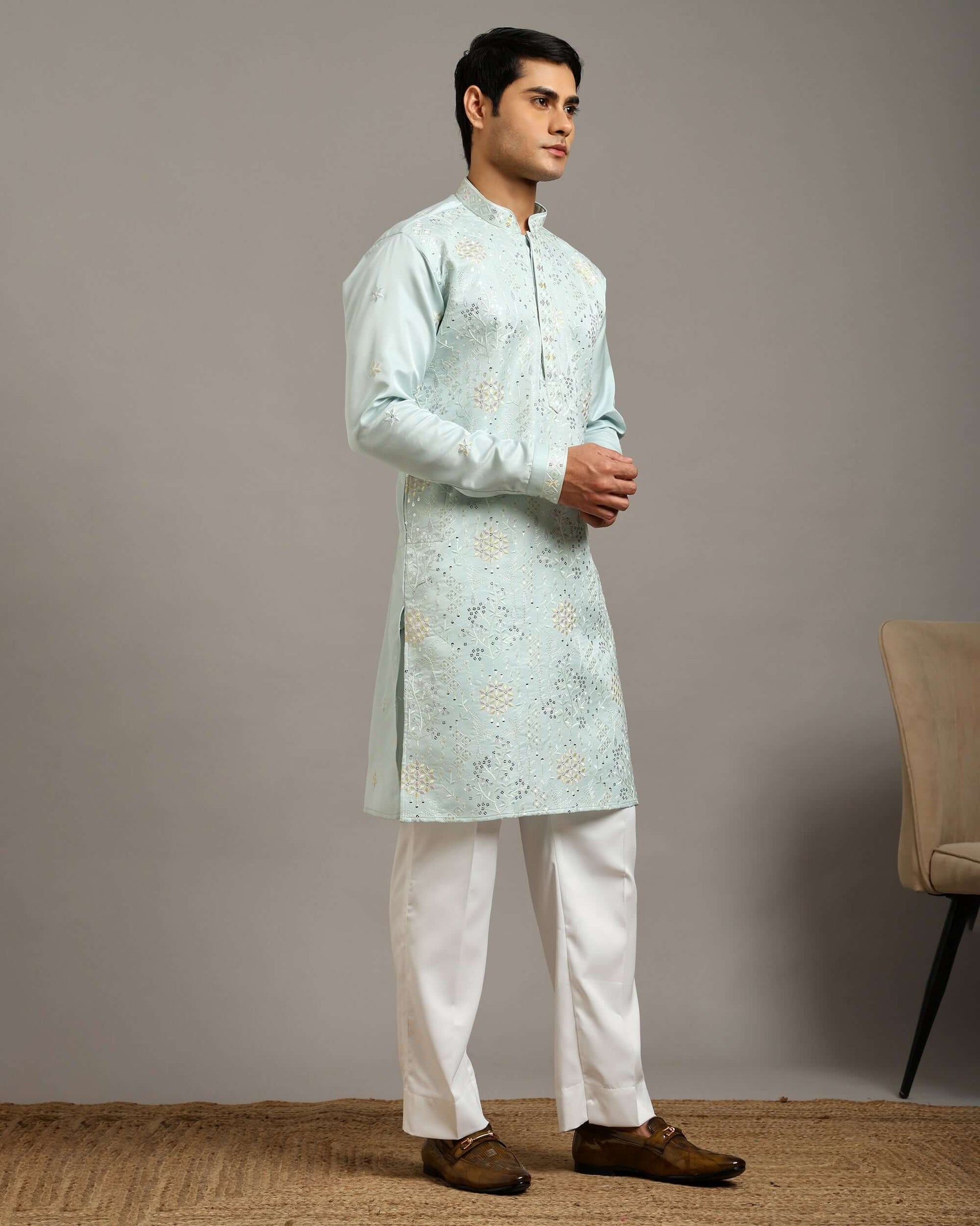 Ideal men's outfit for wedding function, wedding ceremony, Indian cultural event, and festive gatherings. The Ira Floral Embroidery Wedding Sky Blue Kurta for Men is suitable for groom wear, groomsmen, and wedding guests. Style this men’s kurta outfit with white or ivory pajama and classic footwear for a complete men’s outfit for wedding celebrations.