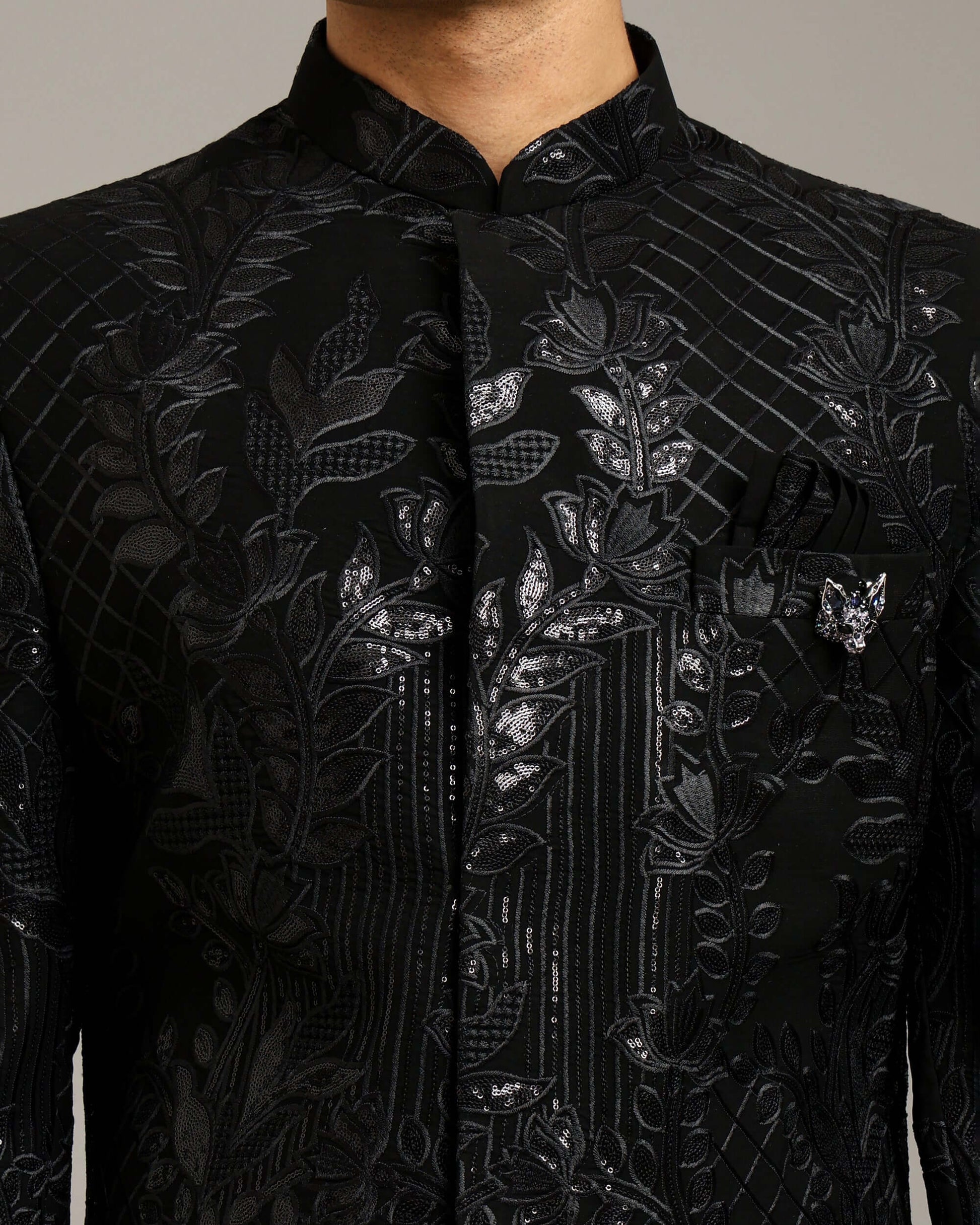 The Kosha Textured Black Indo Western Dress for Men features dense embroidery arranged in layered textures that add depth across the garment. This men’s indo western dress is designed for statement dressing, offering strong surface detailing while maintaining a structured silhouette. As a wedding indo western dress, it provides a bold option for men seeking a standout men’s wedding outfit.