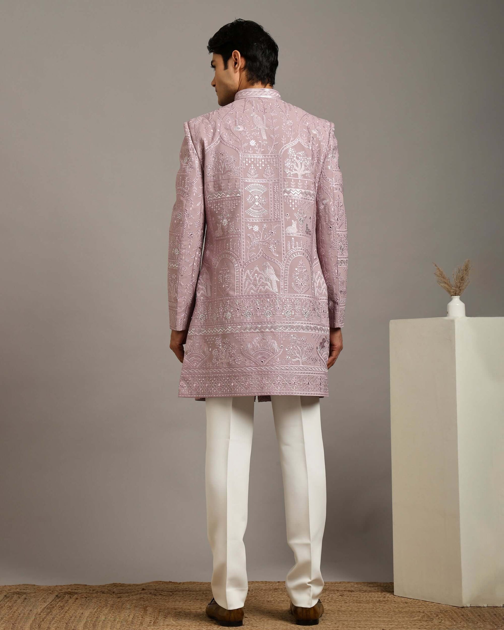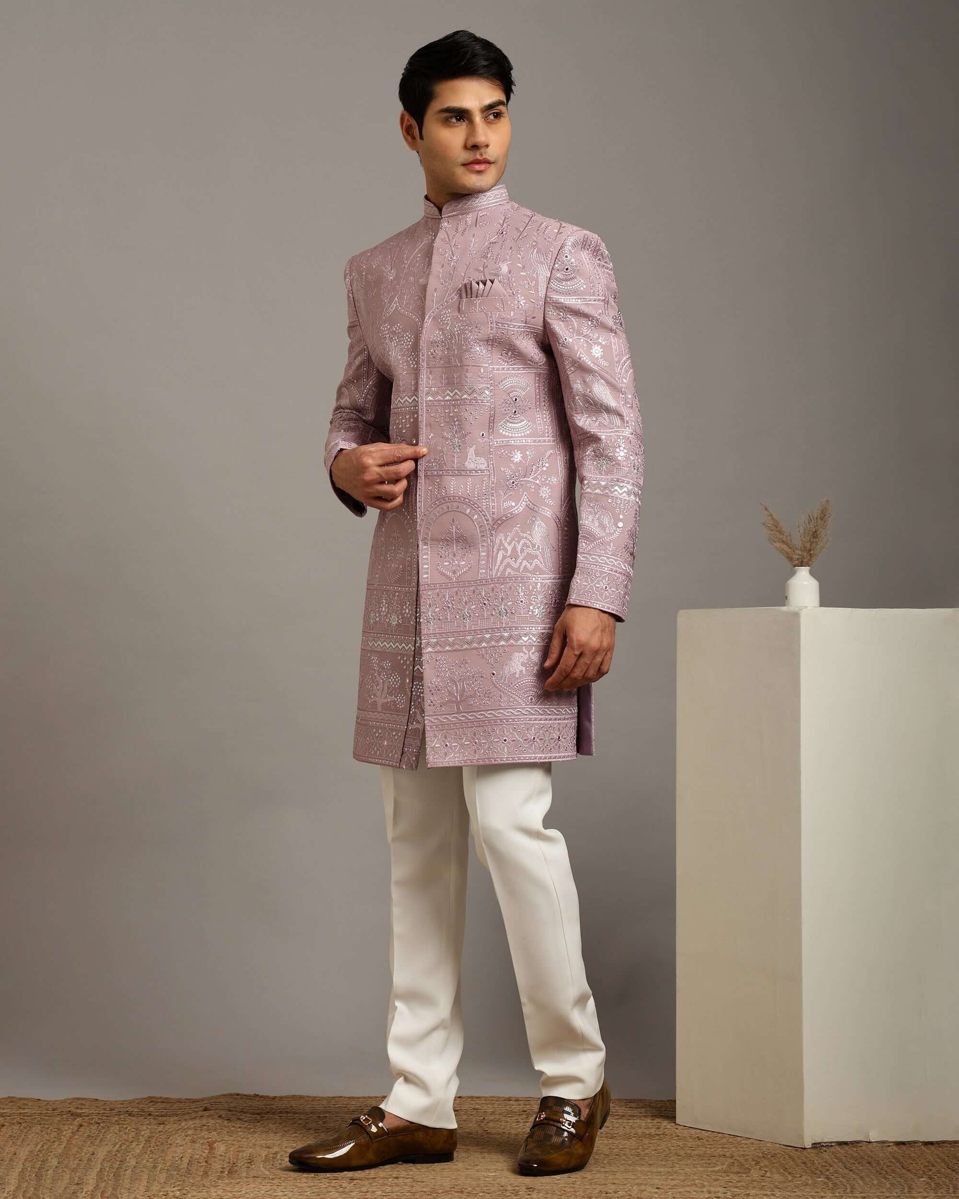The Kosha Vana Blush Pink Indo Western Dress for Men features nature-inspired embroidery with floral and organic motifs arranged across the fabric. This men’s indo western dress offers a softer colour palette while maintaining heavy embroidery work, making it suitable for daytime and evening functions. As a wedding indo western dress, it delivers visual detail without overpowering the look, fitting well into modern men’s wedding outfit choices.
