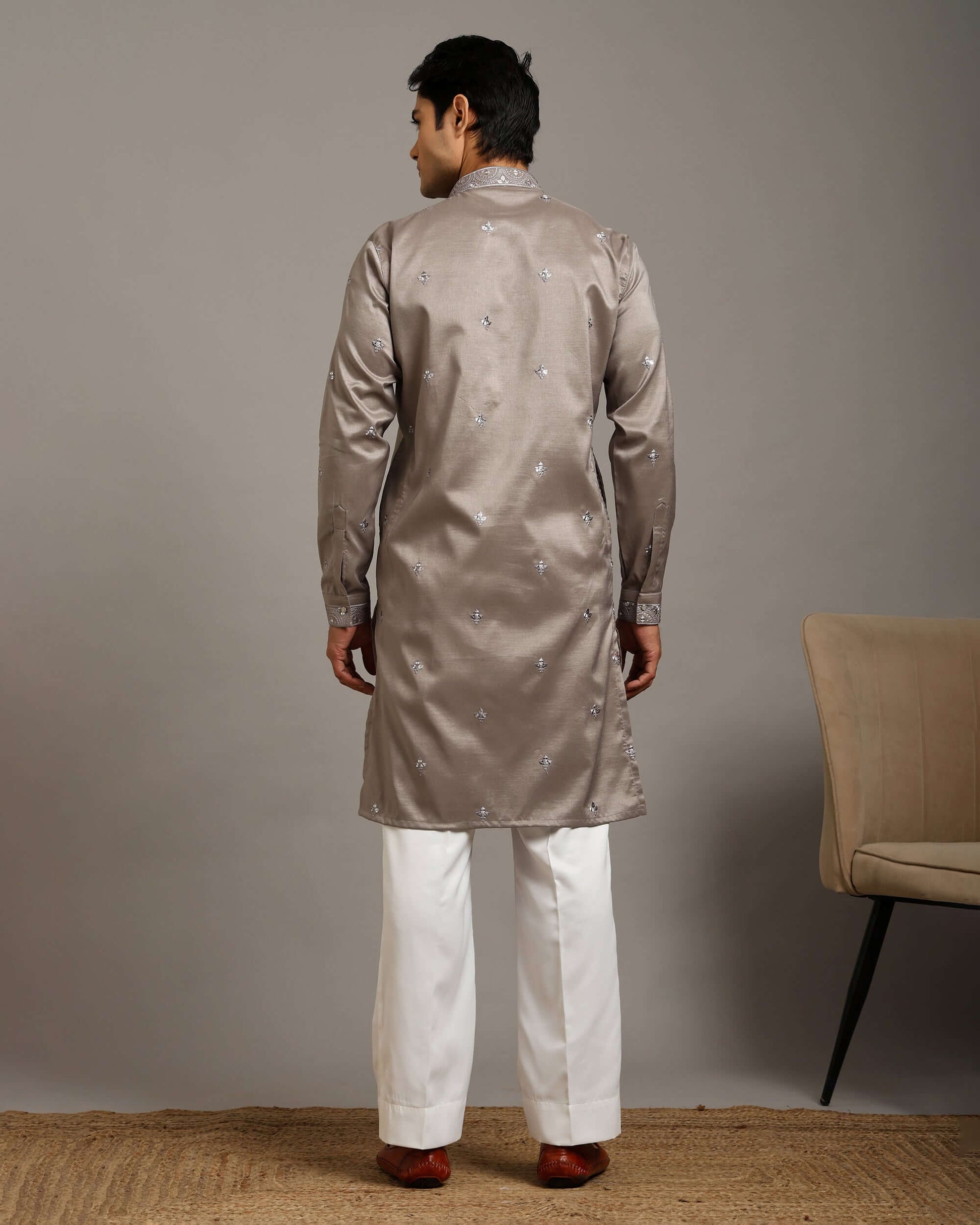 The Noor Silver Grey Reception Kurta for Men with Embroidery Work is created for evening wedding events with a modern colour tone. Made in silk fabric, this men’s kurta features sequin and embroidery work from neckline to front and includes a soft inner lining for comfort during long celebrations. This men’s kurta outfit fits well as a men’s kurta for wedding receptions and formal events.