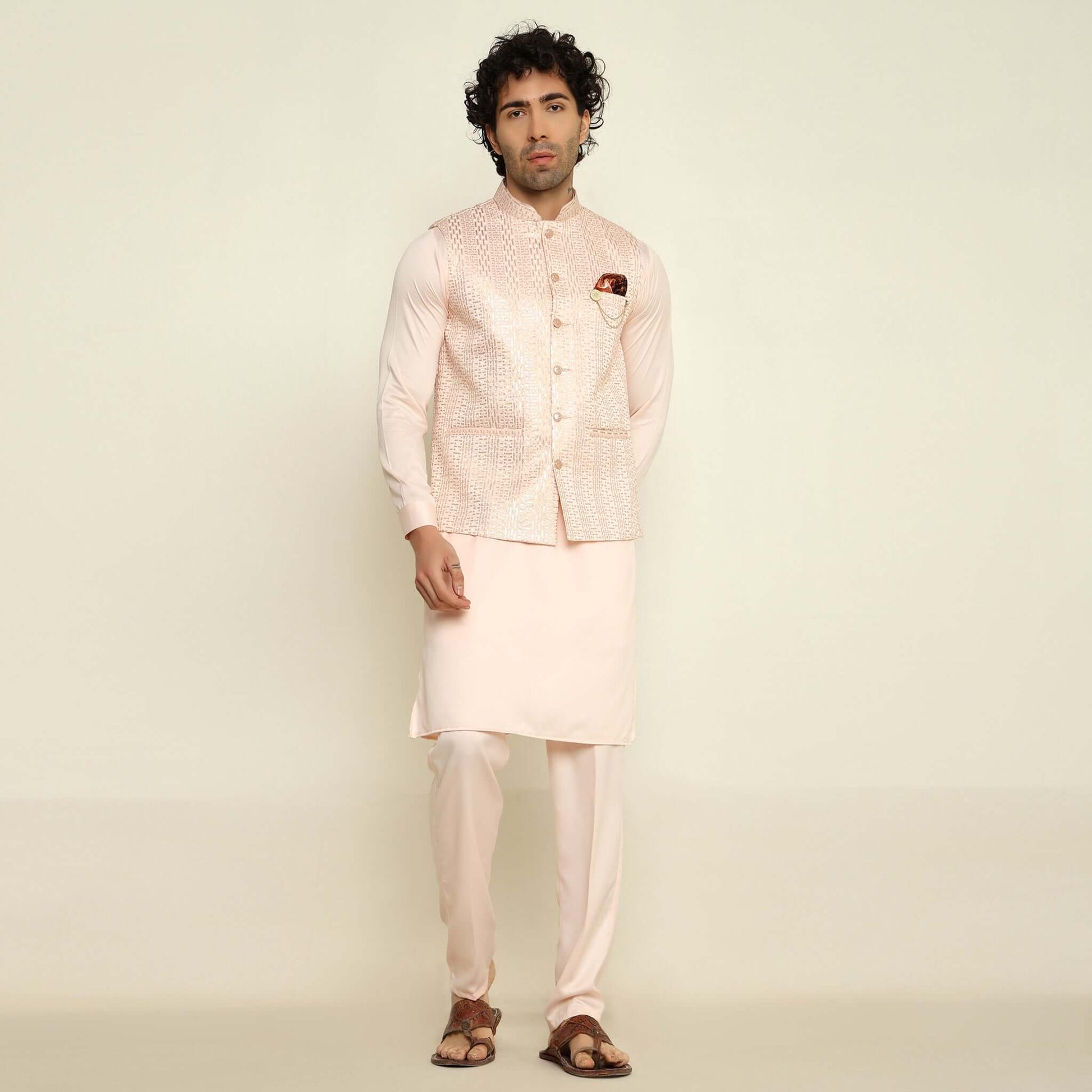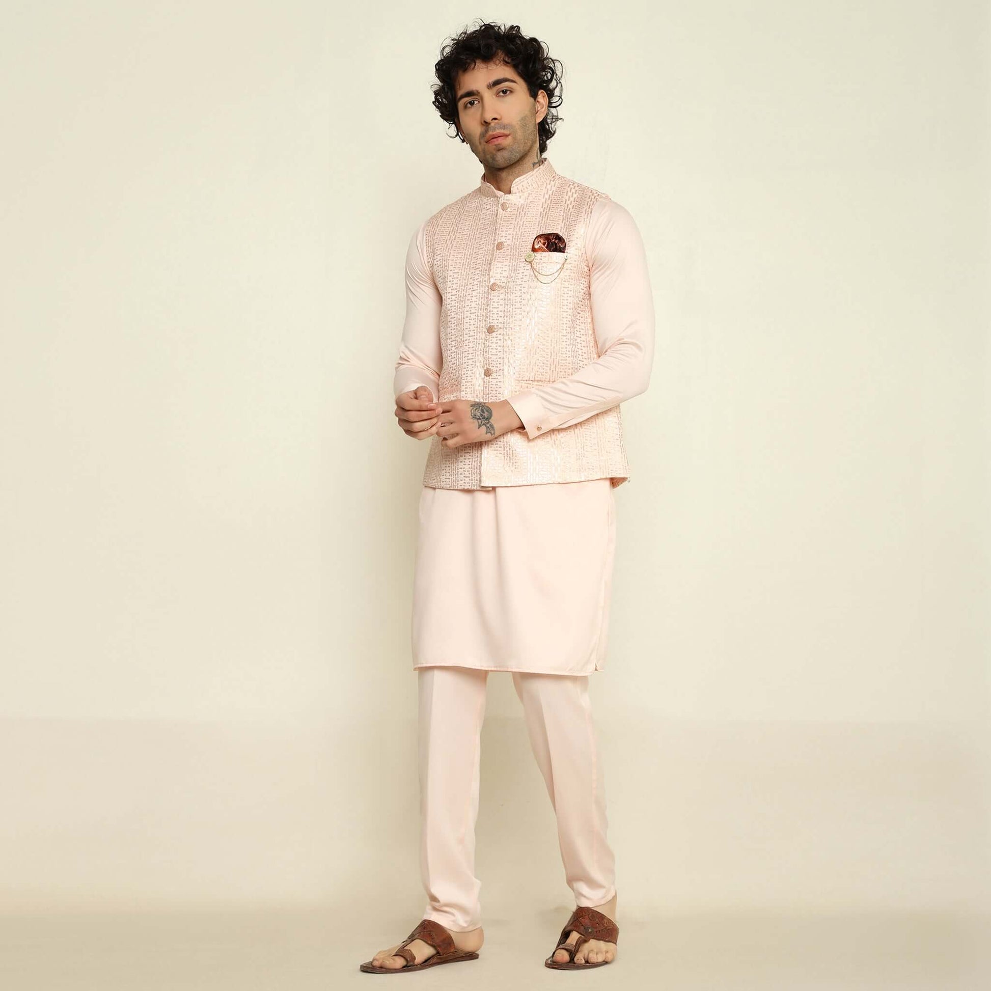 Pink Sequence Embroidered Kurta Koti Set for Men
