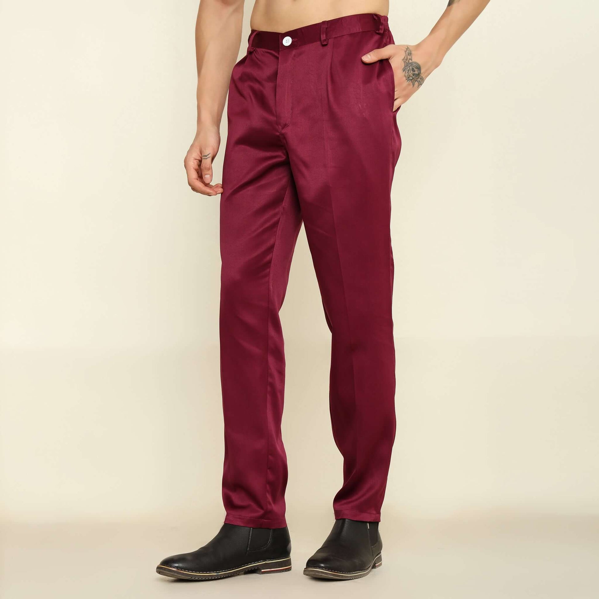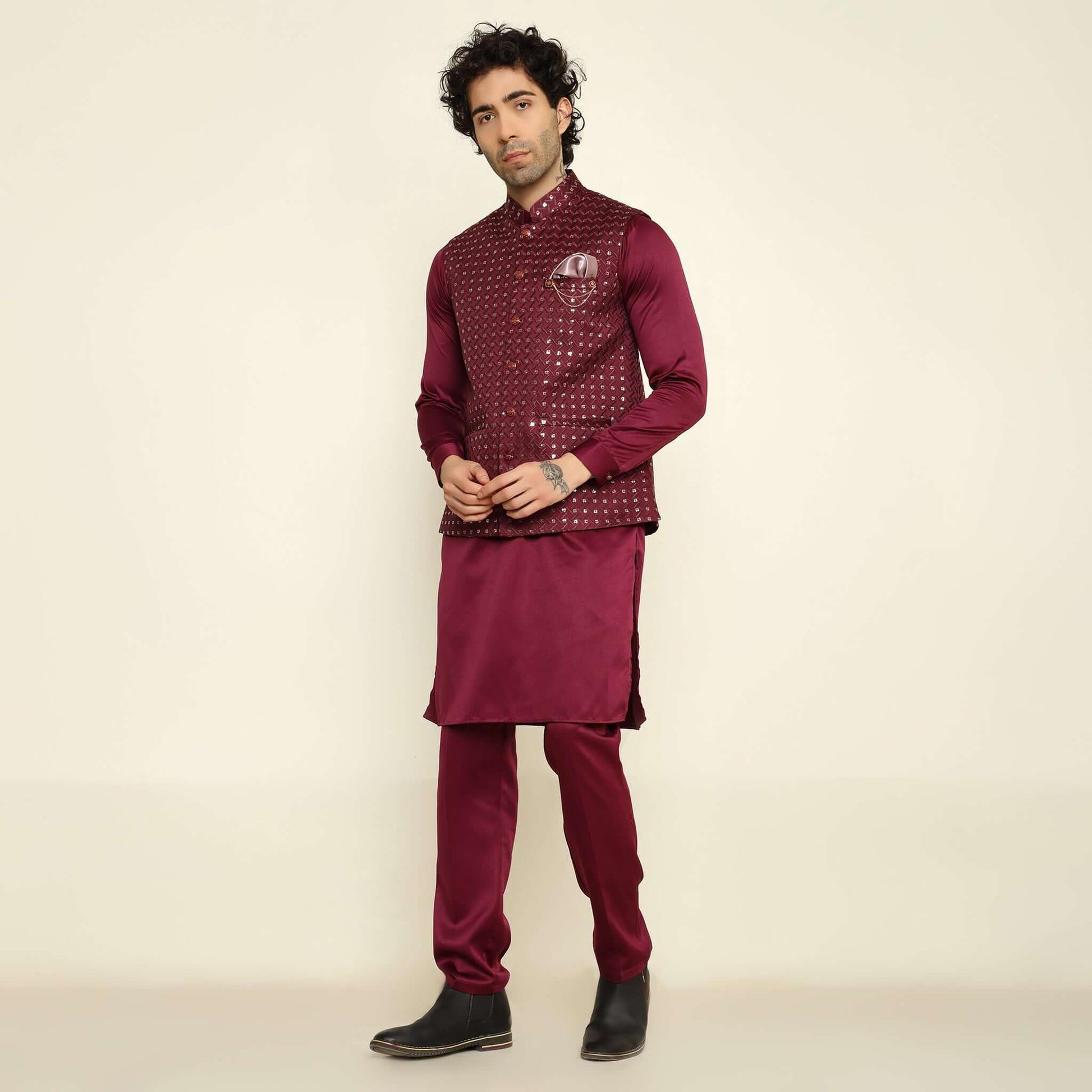 Wine Sequence Chikan Embroidered Kurta Koti Set for Men: This men's wine-colored satin kurta set showcases a masterfully crafted koti with elegant chikankari embroidery and sequin embellishments. The full-sleeve kurta and statement koti are crafted in premium satin fabric, complemented by matching pants. The meticulous blend of traditional needlework and modern sequin details creates a rich, festive appeal.