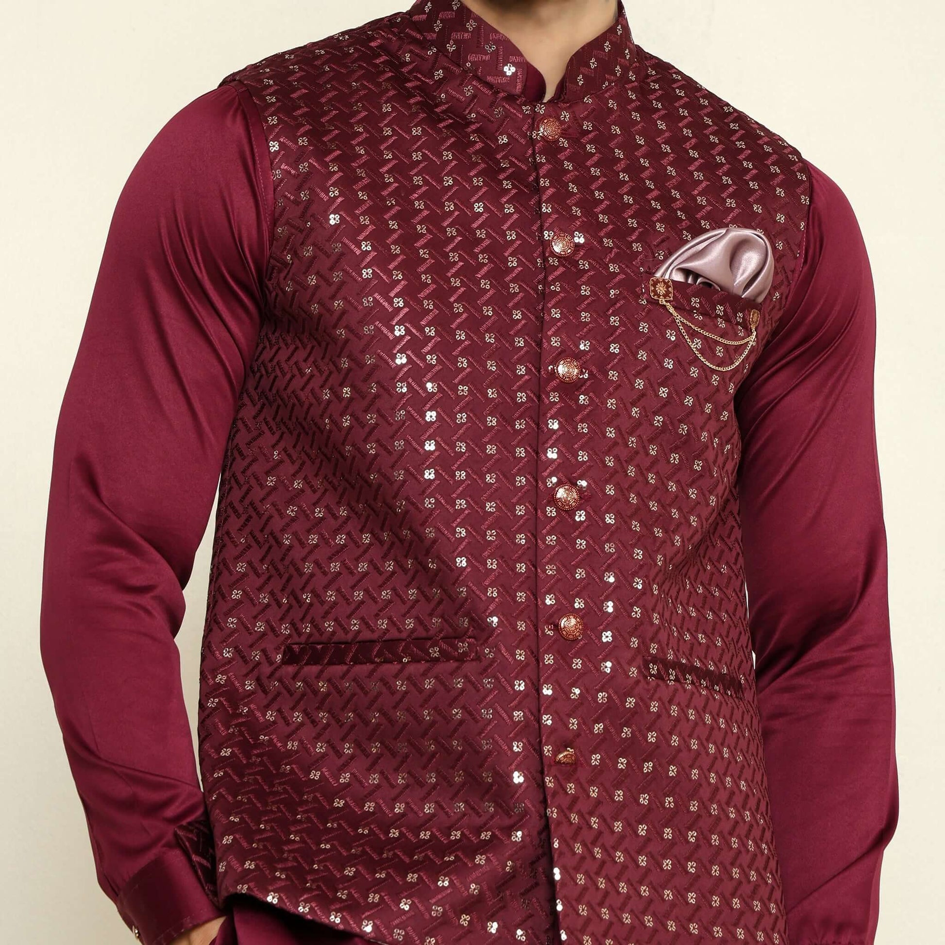 Wine Sequence Chikan Embroidered Kurta Koti Set for Men